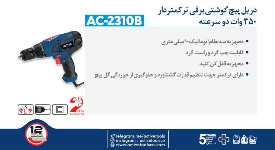 دریل پیچ گوشتی برقی ترکمتردار 350 وات دو سرعته اکتیو تولز AC-2310B