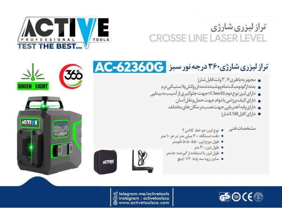 تراز لیزری شارژی 360 درجه نور سبز اکتیو تولز AC-62360G