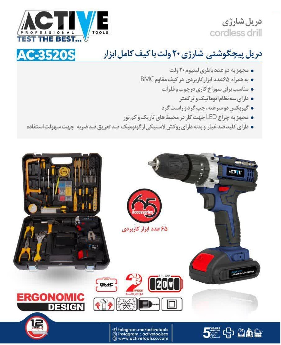 دریل پیچ گوشتی شارژی 20 ولت با کیف کامل ابزار اکتیو تولز AC-3520S