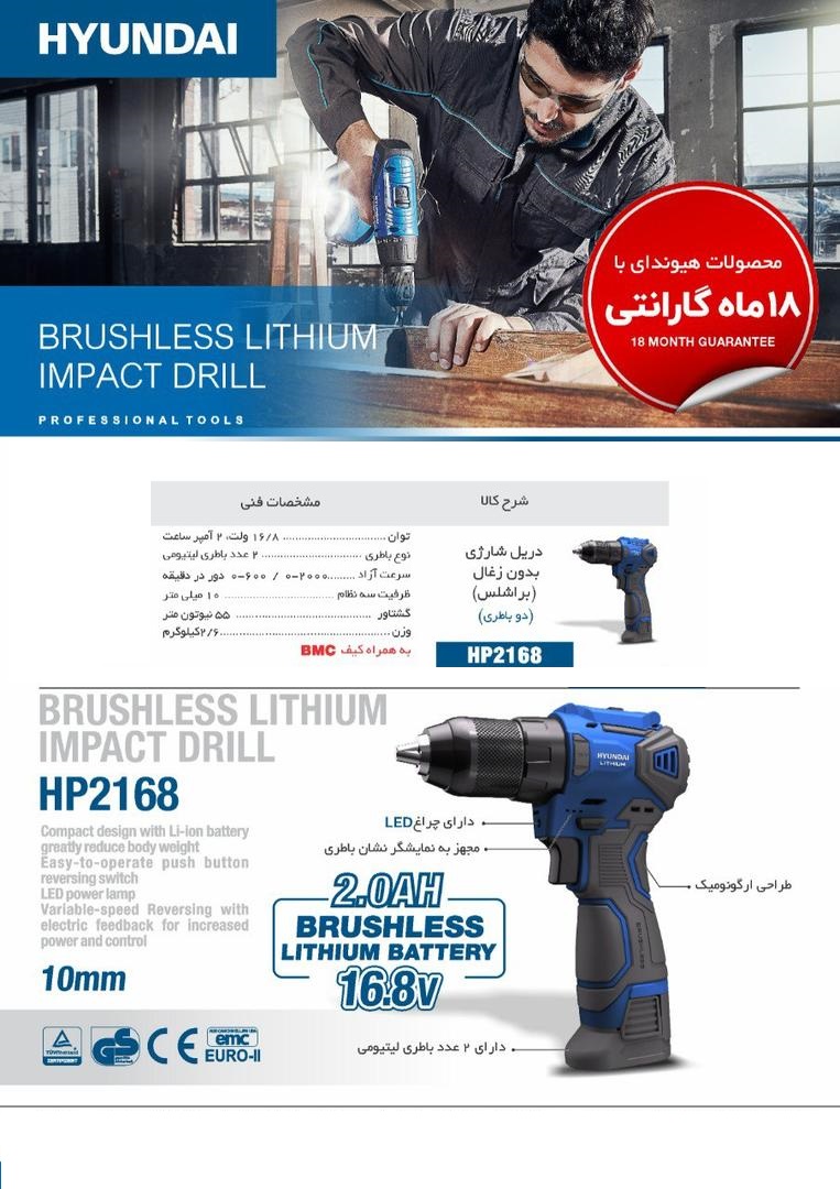 دریل 10 شارژی براش لس هیوندا HP 2168 همراه با کیف BMC