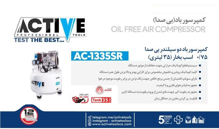 کمپرسور هوا دو سیلندر بی صدا 0/75 اسب بخار 35 لیتری اکتیو تولز AC-1335SR